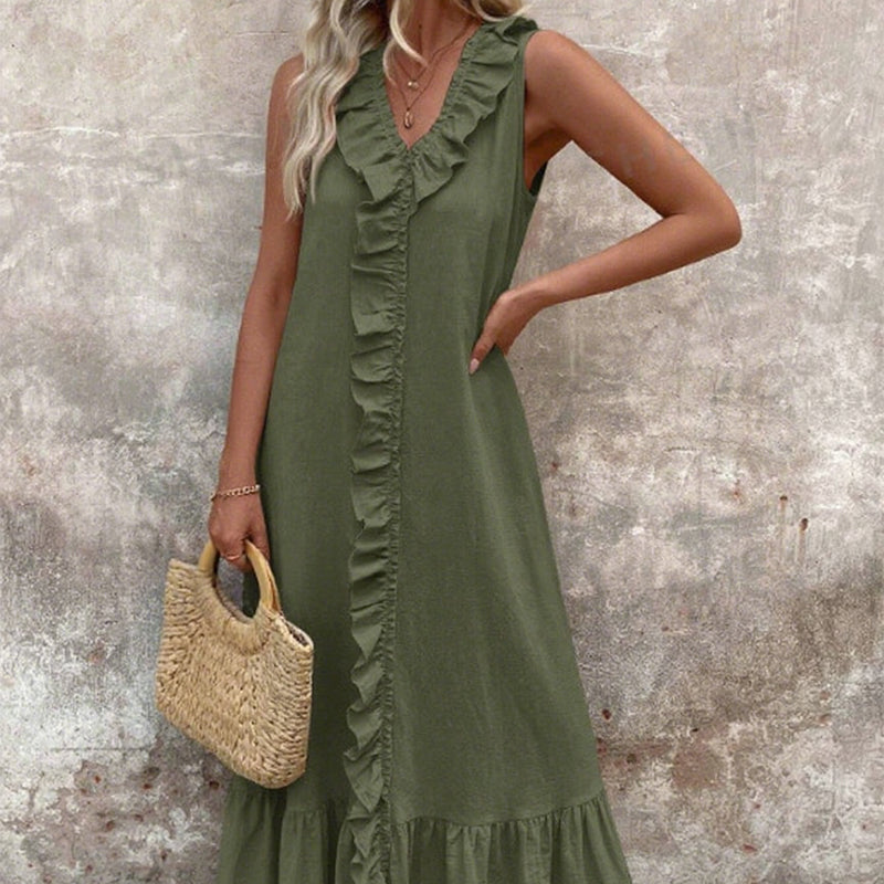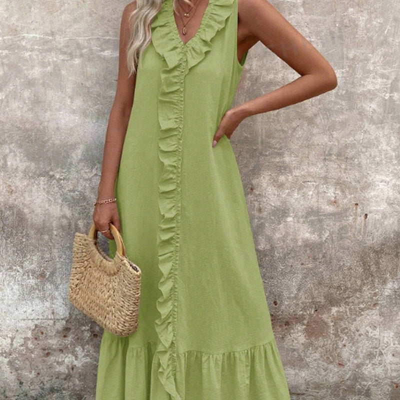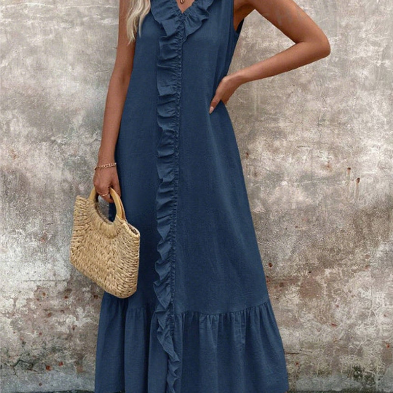 Package Included: 1 * Women's Casual V-Neck Sleeveless Ruffled Maxi Dress